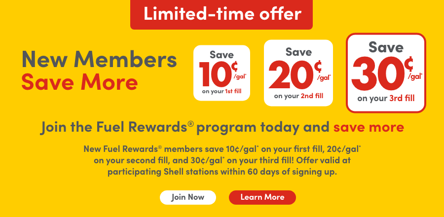 *Restrictions apply. At participating Shell stations. Limit 20 gallons per fill-up. Offer valid from January 1, 2026, through December 31, 2026 (the "Offer Period"). Under this offer, net new Fuel Rewards® members can earn up to three rewards: (1) a one-time reward of 10¢/gal on your first fill-up; (2) a one-time reward of 20¢/gal on your second fill-up; and (3) a one-time reward of 30¢/gal on your third fill-up (collectively, the "New Member Acquisition Rewards"). All New Member Acquisition Rewards must be redeemed within 60 days of joining the Fuel Rewards® program (the "Offer Time Frame"). The New Member Acquisition Rewards savings are inclusive of your new member Complimentary Gold Status savings of 5¢/gal. Visit www.fuelrewards.com/status for complete tier status terms and conditions.